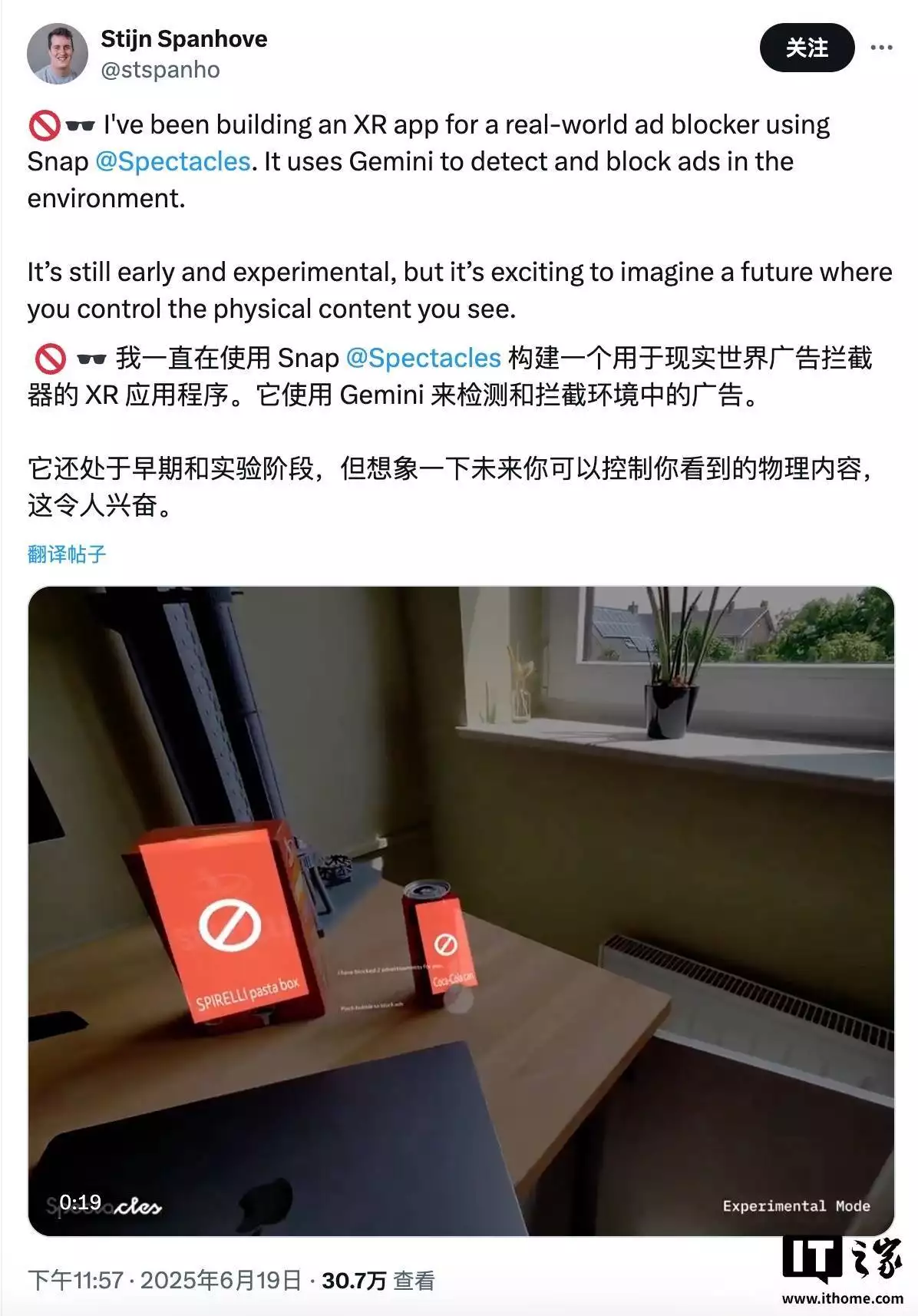 实测效果显示,该应用能够成功识别街头海报、广告牌,甚至报纸上的广告内容,并加以视觉遮挡,形成一个个红色标识。他表示,这个项目目前仍处于初期探索阶段,能设想一个由“你决定眼前看到什么的未来”,实在令人振奋。他还在评论区提到,未来可能开放更多个性化功能,比如将红色方框换成用户自选照片或便签列表等。