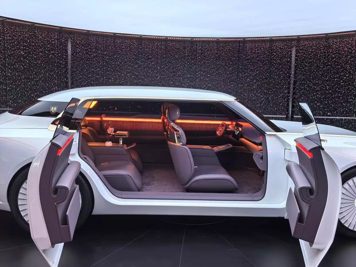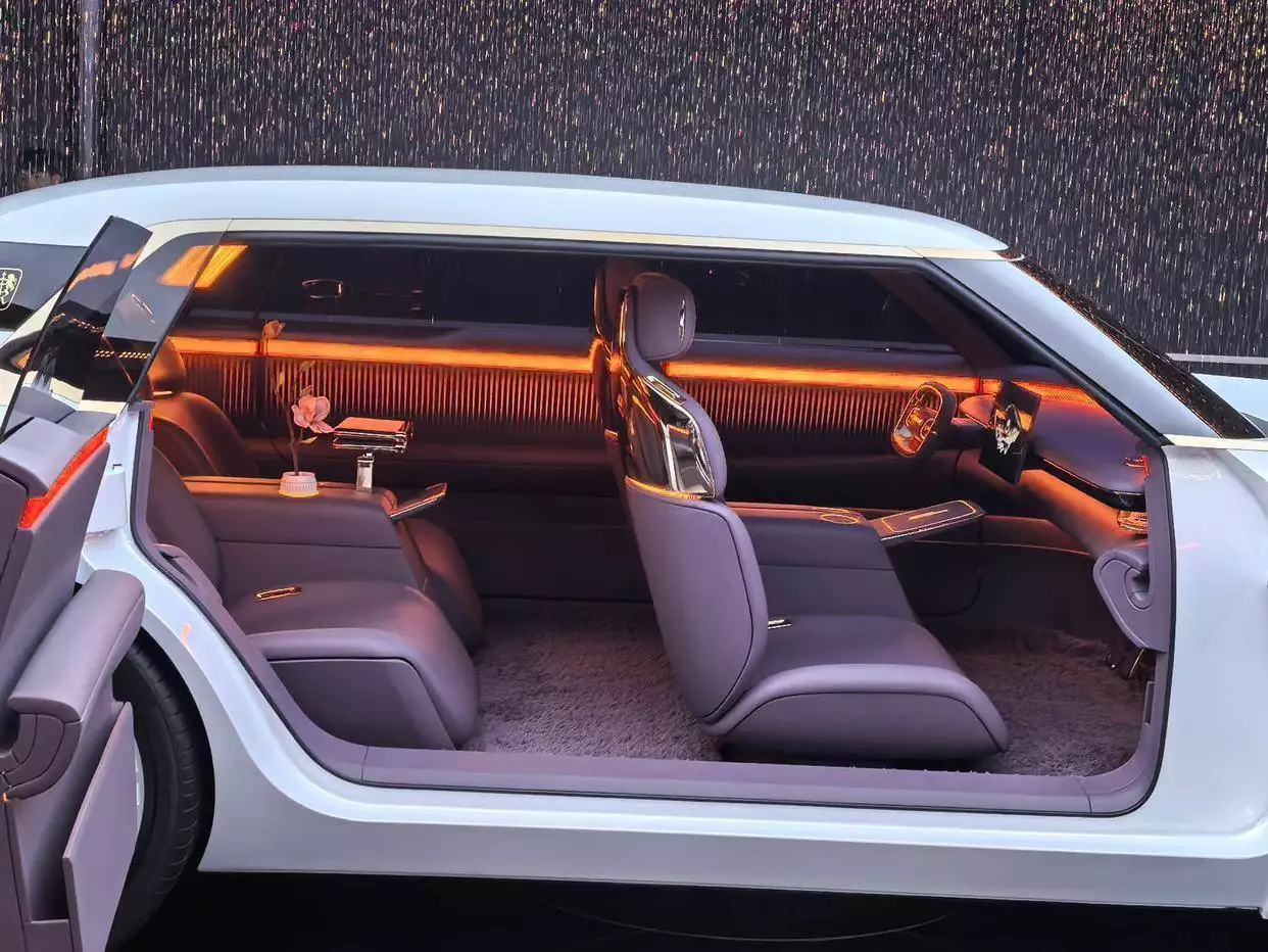 空间和座椅方面,打开车门,可以发现该车采用了对开门设计,这一点和劳斯莱斯也很相似,但是车门的开启角度却针对中国城市停车场景进行了优化,最大开启角度可达72度。